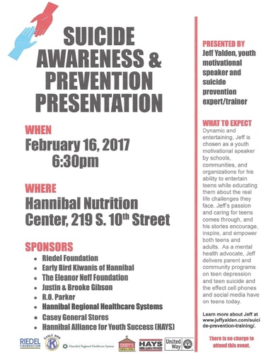 The Hannibal Alliance for Youth Success (HAYS) organization is bringing Jeff Yalden to Hannibal, MO to have a conversation about the realities of suicide and its aftermath effects on all of us. But most of all, Jeff wants to speak to our young people about how important they are and about living their lives in a way they will realize each and every one of them have worth; that their lives matter. He wants to help our community prevent suicides, not have to deal with its aftermath.